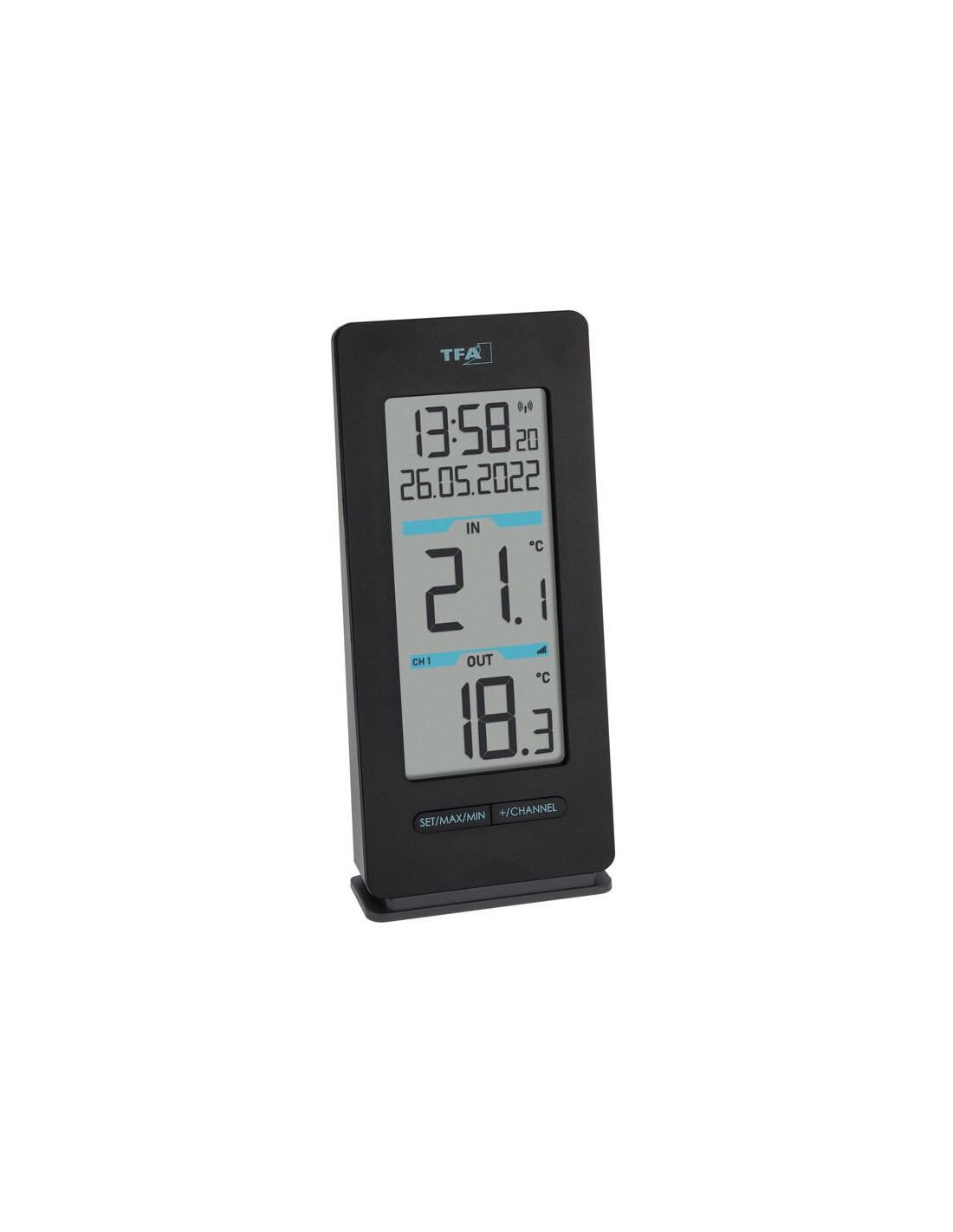 TFA-Dostmann 30.3072.01. Utilizar con: Interior / exterior, Tipo de visualizador: Digital, Color del producto: Negro, Blanco. Unidad de medida de temperatura: °C, Rango de medición de la temperatura: -40 - 60 °C, Tipo de reloj: Digital. Fuente de energía: Batería, Voltaje de la pila: 1,5 V. Ancho: 30 mm, Profundidad: 69 mm, Altura: 150 mm