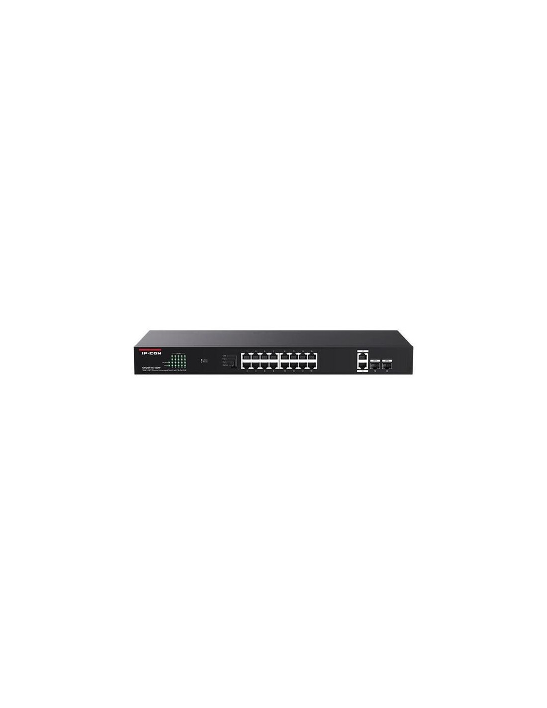 IP-COM Networks G1120P-16-150W. Tipo de interruptor: No administrado. Puertos tipo básico de conmutación RJ-45 Ethernet: Gigabit Ethernet (10/100/1000), Cantidad de puertos básicos de conmutación RJ-45 Ethernet: 18. Tabla de direcciones MAC: 8000 entradas, Capacidad de conmutación: 40 Gbit/s. Estándares de red: IEEE 802.3, IEEE 802.3ab, IEEE 802.3af, IEEE 802.3at, IEEE 802.3u, IEEE 802.3z. Energía sobre Ethernet (PoE). Montaje en rack, Factor de forma: 1U